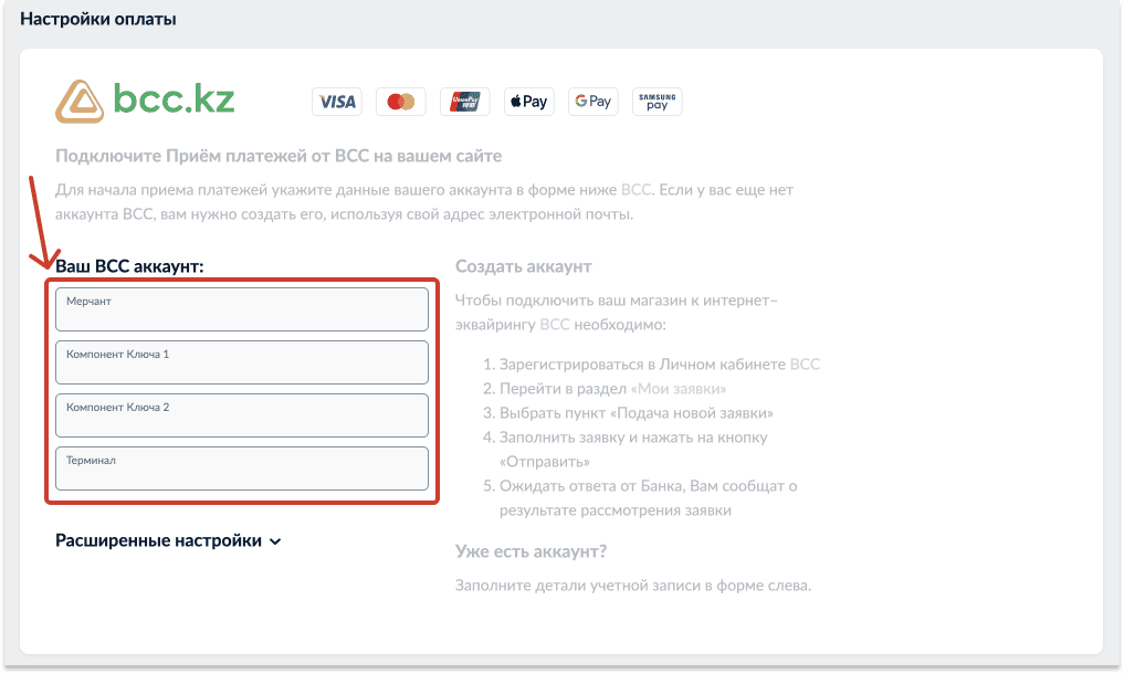 To integrate your online store with Ecom online acquiring from BCC, you need to enter 4 parameters: