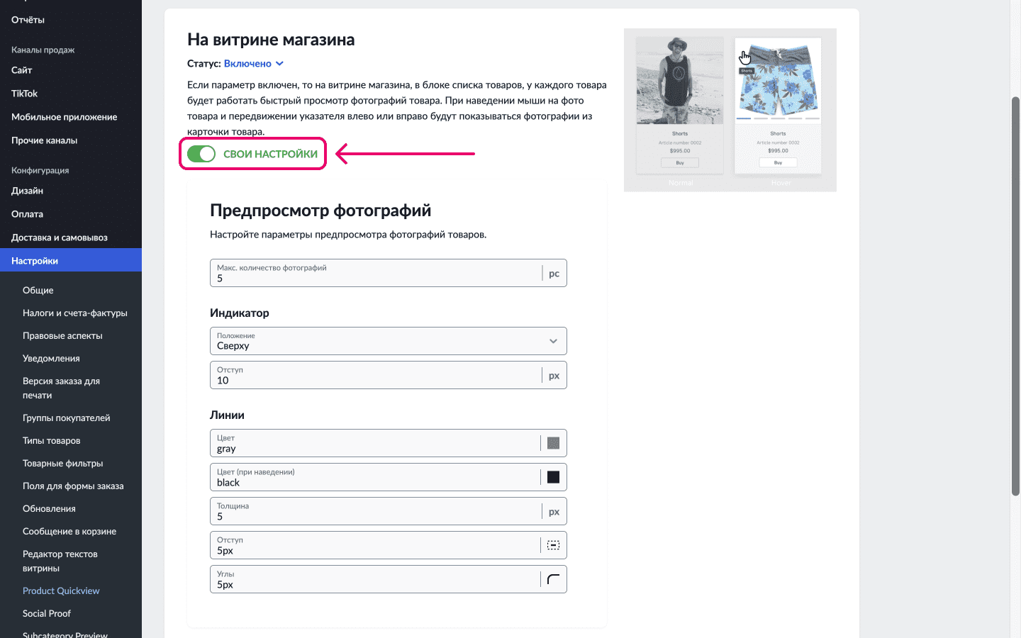 Select the "Enable" status. To adjust the number of images and customize the preview indicator design in the product list, go to the relevant section and choose your preferred settings