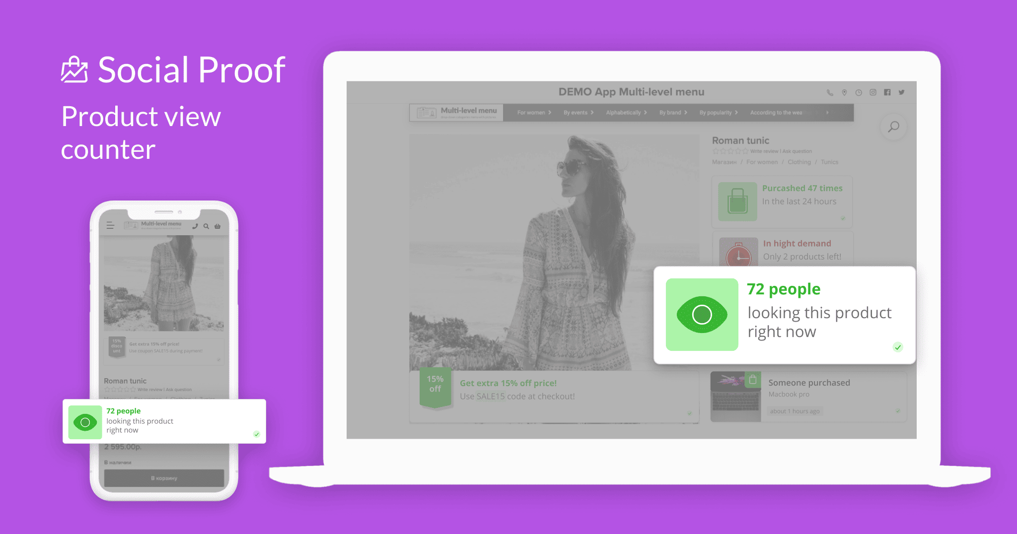 <figure><img src="https://606730935-files.gitbook.io/~/files/v0/b/gitbook-x-prod.appspot.com/o/spaces%2Fb8tXvs0XGg1dcXcoJqFy%2Fuploads%2FP2332kmaOmTWCKJrNYvd%2Fsocial_proof_for_ecwid_Product_watching_counter%20_2.png?alt=media&#x26;token=4673f70e-e42c-4a33-a631-eadd8f693c96" alt=""><figcaption><p>Счетчик просмотров товара</p></figcaption></figure>